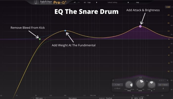 There really is no hard and fast rule in this case, like it was with the kick, but let me sell you this idea- try using small eq moves on the snare. Also, I caught myself dozens of times bypassing all of my plugins to find that the snare actually sounds better without any of the processing!